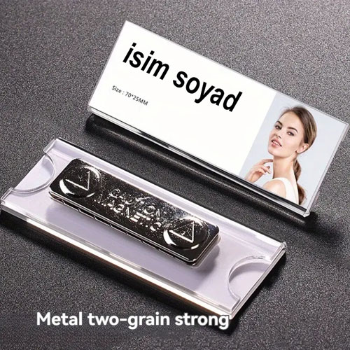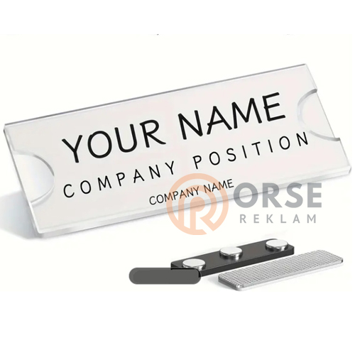 Akrilik malzeme ile hazırlanan isimlik modeli. Arasına kağıt koyarak tekrar kullanıma uygundur. Arka kısmı mıknatıslı veya iğneli olarak üretilir. Ölçüleri 7×2.5 cm veya 7x3cm dir.